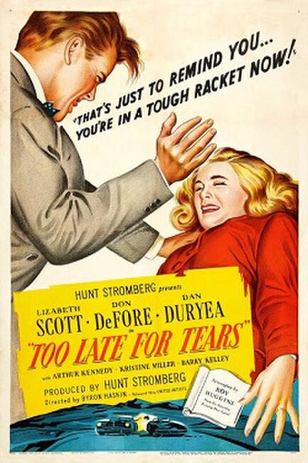 A vintage movie poster featuring a man and a woman in a dramatic pose. The man is on the left, wearing a suit and tie, with his right hand raised as if to protect the woman. The woman is on the right, wearing a red dress, with her head tilted back and her eyes closed, appearing to be in distress. The poster has a yello... | Too Late for Tears Photos + Posters | 561eee4da3a94d837e6a172eed96548a2215233bf1c6ae86c2d325a371a4b5ba | 000720969272 | 0 | 0 | 97 | 7 | 0 | 0 | |