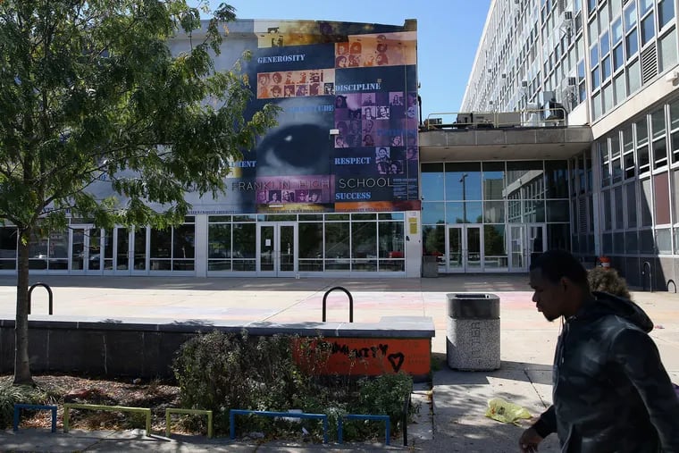 A man is walking on a sidewalk in front of a building with a large mural on its side. The mural features a close-up of a person's eye and various other images. There are benches and trash cans along the sidewalk, and the building has large windows. The sky is clear and blue. | Tests have revealed damaged asbestos inside Benjamin Franklin High School (above), which is now shared with Science Leadership Academy. | 18d2bd440ff3f14cadee430dc37c1e3929681b4b63d2591fdfc5451659b87b93 | 000720969211 | 0 | 0 | 53 | 19 | 0 | 0 | |