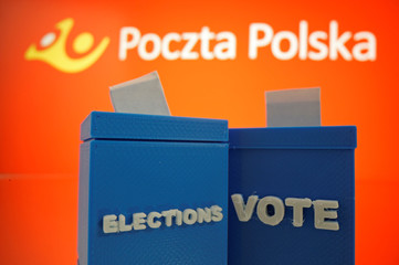 Two blue voting booths with the word 'VOTE' written on them are placed in front of a large orange sign with the text 'POCZTA POLSKA' in white letters. The booths are positioned side by side, and the sign is in the background. | A 3D printed ballot boxes are seen in front of displayed Poczta Polska logo in this illustration | 665c259f011bd2ae628758a609f3687ddcfe01843de1047699fd72eab2706bef | 000720970132 | 0 | 0 | 42 | 17 | 0 | 0 | |