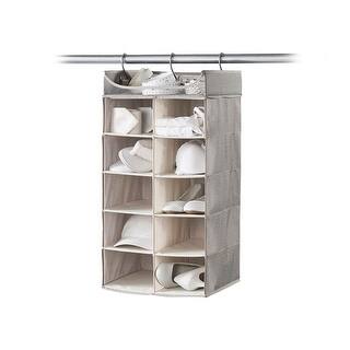 A modern, multi-tiered shoe rack with a sleek design, featuring a combination of open shelves and closed compartments, is displayed against a white background. The rack is made of a light wood tone and is empty, showcasing its clean lines and minimalistic aesthetic. | Neatfreak - 2X5 Hanging Closet Organizer with Top Shelf - Gray | fe785306d1cf539e9bd0fd85abb44e6ece28dee297cc41dfd55470913294c4f8 | 000720971508 | 0 | 0 | 43 | 11 | 0 | 0 | |