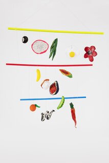 A collection of various fruits and vegetables is arranged on a white background. The items include a red tomato, a yellow banana, a green bell pepper, a red onion, a red chili pepper, a green leaf, a red flower, a yellow egg, and a red and white checkered pattern. The items are placed on a yellow and blue striped surfa... | Laura Chautin Mobiles | 08aeac5177669263de2ad086bec004a78374c981517d86873ade503f14f39acf | 000720971430 | 0 | 0 | 60 | 3 | 0 | 0 | |