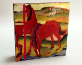 A small, colorful, hardcover book with a red spine and a cover featuring a stylized painting of two horses in a field. The book is placed on a white surface against a white background. | Franz Marc - Grazing Horses IV (The Red Horses),1911 - Original Art with Mixed Construction Technique. | f00d341f998336960b495811d1298f2fae82a805798fc36daa89b92d7a4a2f5e | 000720971476 | 0 | 0 | 34 | 16 | 0 | 0 | |