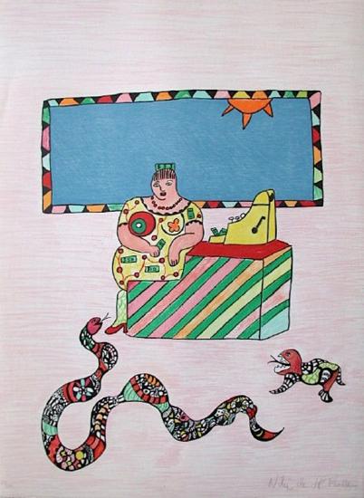 A child's crayon drawing of a heavyset woman sitting on a colorful striped box, playing a piano with a snake coiled around her legs and a small bird on the ground beside her. The background features a blue sky with a sun and a patterned border. | Mechant-Mechant - la Caissiere-Niki De Saint Phalle-Limited Edition | dc6df87ae16c33126bd474879f7c5007e053ca28d1a3bcaf4ab392d36c918de2 | 000720971555 | 0 | 0 | 46 | 8 | 0 | 0 | |