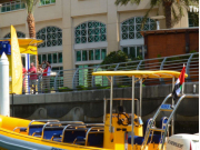A yellow speedboat with a canopy is docked at a pier. The boat has a flag with a red, white, and black design on the right side. There are several people on the pier, some of whom are standing near the boat. The background features a building with arched windows and a palm tree to the left. | Yellow Boats Dubai Location2 | b3e0dcfb331ba4535146ea07203b2d5d3a48d07c031429de52fb417812f53e05 | 000720931236 | 0 | 0 | 57 | 4 | 0 | 0 | |