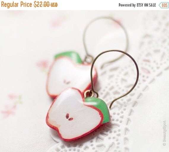 A pair of earrings with a red apple design on a white background. The earrings are attached to a silver hook and have a green stem. The image is overlaid with a text box containing a regular price of $2.90 CAD and a sale price of $1.45 CAD, along with a 'powered by Etsy' logo and a'sale' tag. | Red apple earrings - Fruit jewelry (E049) | c3473129237e0b3ad306749e0f3e94f091ffc72d7079313c73dfef289e41a6e6 | 000720931211 | 0 | 0 | 58 | 7 | 0 | 0 | |