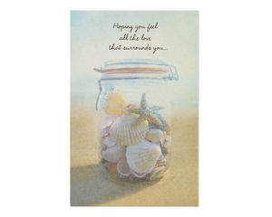 A clear glass jar filled with various seashells and starfish is placed on a surface. The jar has a metal lid and is positioned against a light background. Above the jar, there is a text overlay that reads 'Hoping you feel all the love that surrounds you...' in a cursive font. | Seashells Sympathy Card | 5e92f1d2a4389503693c689f8bd2568b2c87860091fc781f87edd23c4d7ff8b0 | 000720931173 | 0 | 0 | 51 | 3 | 0 | 0 | |