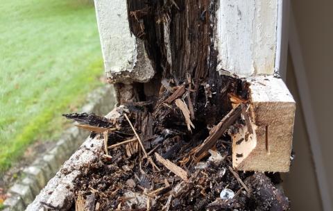 A close-up view of a window frame with peeling paint and a damaged wooden section. The paint is chipping off, revealing the wood underneath. There are some debris and dirt accumulated around the damaged area. The window is set against a backdrop of a green lawn. | Rotten Sash Box | bf245c0becbc26b92e9e2e2470b799a6003e0ca777f7d297a795bf77f6092419 | 000720931235 | 0 | 0 | 46 | 3 | 0 | 0 | |