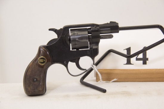 A vintage revolver with a wooden grip and a black metal body is displayed on a white background. The revolver has a cylinder with six chambers and a trigger guard. A number '14' is visible in the background, possibly indicating the number of the exhibit or a reference number. | R.G. Ind, Model RG14, Revolver, 22 cal | bc43f64077ffcd08f12ff49705751e403af240ed4e35ac1fbfa20ea4438c4a06 | 000720972123 | 0 | 0 | 49 | 7 | 0 | 0 | |