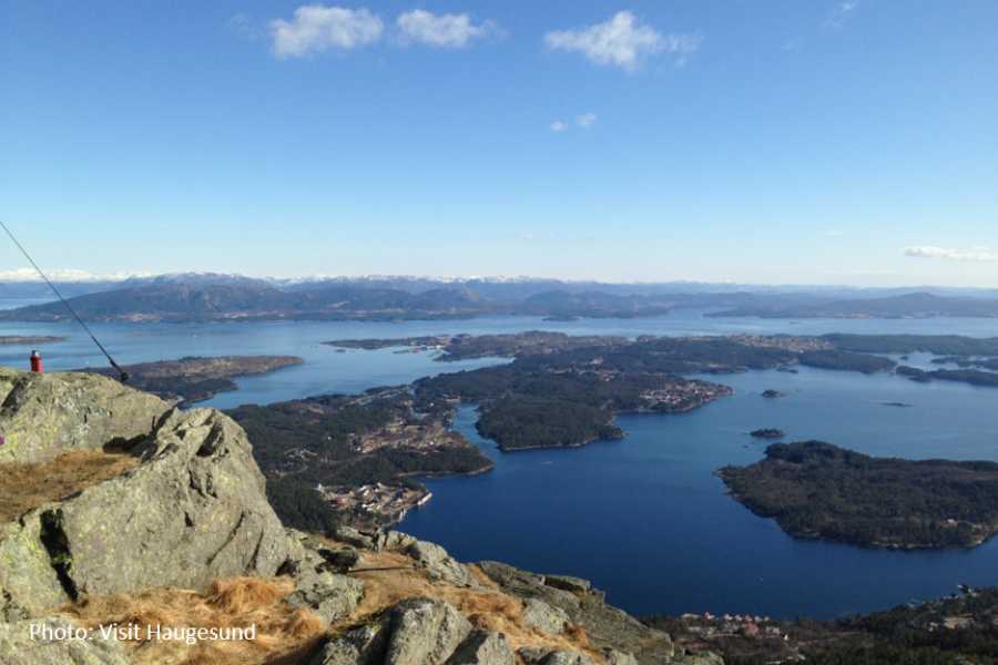 A person is standing on a rocky outcrop overlooking a vast landscape of mountains, lakes, and forests. The sky is partly cloudy with a few clouds scattered across the blue expanse. The person is wearing a red jacket and is holding onto a rope that is attached to a harness. The landscape below is dotted with numerous is... | Travel like the locals EXPERIENCE LEIRVIK AND STORD | 656b235f4d51119935a55a72d28dc8fd2969e7fd5fc8b8cec88e90aaedaf52a8 | 000720972377 | 0 | 0 | 63 | 8 | 0 | 0 | |