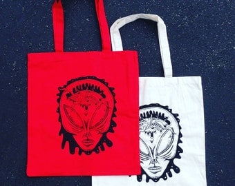 Two tote bags are placed side by side on a surface. The bag on the left is red with a black design featuring a face with a crown-like structure on its head. The bag on the right is white with the same black design. | Alien Tote | de93a1942e09d4a8c8ca8e40b8ed2a737337aaea68c12197b73251946706e09e | 000720972437 | 0 | 0 | 44 | 2 | 0 | 0 | |