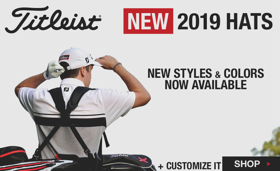 The second image is a promotional poster for the 2019 collection of hats from the golf brand Titleist. The poster features a man in a golf outfit, including a white shirt with a black logo, a white hat, and a black and red golf bag. The man is holding a golf club and appears to be adjusting his hat. The poster has a re... | dfada351 Titleist Golf Hats at Golf Locker | 5d26422c6d5b5010589d4fc5dafd9257570160603e0b15b29dd7e589709ec09c | 000720972398 | 0 | 0 | 107 | 7 | 0 | 0 | |