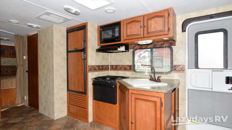 A modern kitchen interior with wooden cabinets and stainless steel appliances. The kitchen features a microwave, oven, and sink with a window above it. There is a refrigerator on the right side, and the floor is tiled. The walls are adorned with decorative tiles and a patterned wallpaper. | 2011 Keystone RV Passport 2850RL | 4fd27dd527e3204184444858318c556d8486af7e498871311b3f3b6f9ee1a02a | 000720973050 | 0 | 0 | 48 | 5 | 0 | 0 | |