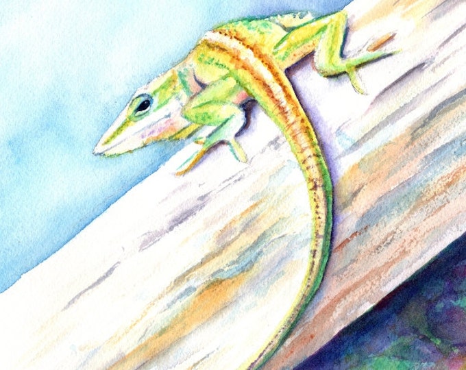 A watercolor painting of a green lizard with yellow stripes on its back, perched on a wooden surface with visible brush strokes and a soft, blended background. | gecko wall art, gecko watercolor painting, gecko hawaii, hawaii art, hawaii animal art, hawaii chameleon, lizard art, kids room original art | 7685118f2914353a20913972bc7ce8c85e2ec87550b222557bc59b28188c714f | 000720973067 | 0 | 0 | 27 | 21 | 0 | 0 | |