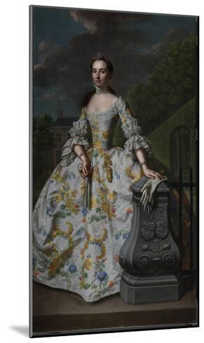 A portrait of a woman in a detailed, ornate dress with a pattern of flowers and foliage, standing next to a classical column with intricate carvings. The woman is holding a fan in her right hand and a sword in her left hand. The background features a cloudy sky and a landscape with trees and a building. | Portrait of Charlotte Beatrix Strick Van Linschoten-Mattheus Verheyden-Mounted Art Print | 66dababe7e5039ff14dedffc94c20e57e4b399a0f5568c595713162960d62ecd | 000720973576 | 0 | 0 | 57 | 10 | 0 | 0 | |