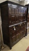 A large, dark wooden dresser with multiple drawers and a mirror on top is placed against a wall. The dresser has a classic design with a simple, elegant appearance. | An 18th century oak press cupboard, W.130cm, D.53cm, H.183cm | 9ea165d88c8c7930c6e756d03cfa833b98dc2ab1d8158e2665e549e8988ddbf7 | 000720973312 | 0 | 0 | 29 | 9 | 0 | 0 | |