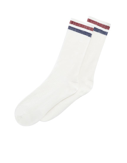 A pair of white socks with red and blue stripes at the top is displayed against a white background. | Striped sports socks | 46a32e772baf4f87709c9e1d6ab6cbf5d4cd98d3c88e68b59799d761d574367c | 000720973442 | 0 | 0 | 19 | 3 | 0 | 0 | |
