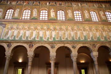The first image shows an interior view of a grand hall with a high ceiling and a series of arched windows. The walls are adorned with intricate frescoes depicting figures in classical attire. The frescoes are rich in color, with a predominance of gold, green, and blue hues. The architecture features ornate columns and ... | Mosaics on the left lateral wall of Sant'Apollinare Nuovo in Ravenna | 7323c2fcca6ebf72a6070c491475ee883de7eaf15f3a2c5f019c2c8b57b89fbd | 000720973432 | 0 | 0 | 82 | 11 | 0 | 0 | |