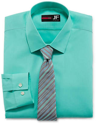 A teal dress shirt with a collar and cuffs, paired with a striped tie, is displayed on a white background. The shirt has a buttoned pocket on the left side and a tag with the initials 'JF' on the collar. | Jf J.Ferrar Slim Fit Dress Shirt And Tie Set Shirt + Tie Set Slim | 36365ef721c9eda9dd9f63c840342e1ce7a5440a5b6b1a25b9de43a677e4b804 | 000720973606 | 0 | 0 | 40 | 14 | 0 | 0 | |