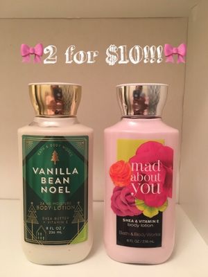 Two bottles of body lotion are displayed side by side on a white surface. The bottle on the left is green with a beige cap and has a label that reads 'Vanilla Bean Noel Body Lotion' with a price tag of $10. The bottle on the right is pink with a silver cap and has a label that reads 'Mad About You Body Lotion' with a p... | Bath & Body Works Body Cream Duo - $20 for Sale in Magnolia, MS | 31240dc066469275335ec06f0040b654249efe2db6f23ebc6c48e1e916da5d59 | 000720973671 | 0 | 0 | 81 | 14 | 0 | 0 | |