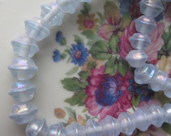 A close-up image of a blue beaded bracelet with iridescent beads, resting on a floral patterned surface. The beads have a shiny, reflective quality, and the floral pattern features a variety of colors including pink, blue, and yellow. The bracelet is coiled on the surface, and the beads are of various sizes and shapes. | Vintage Saturn Shaped Light Blue Glass Beads | 5bd9329c6c523152876d30856485dbc4b17470cc1ae18b575d6738ed2f0dd63d | 000720974035 | 0 | 0 | 54 | 7 | 0 | 0 | |