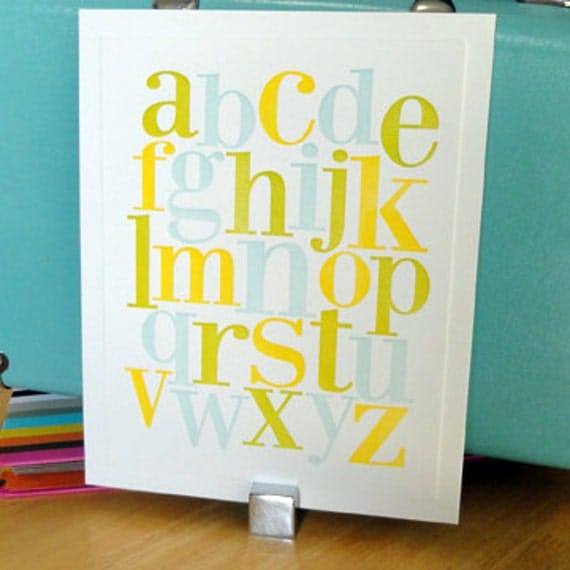 A white card with a colorful alphabet displayed in a modern font is placed on a wooden surface. The card is held up by a metal stand. In the background, there is a teal suitcase and a stack of colorful books. | Letterpress alphabet print in yellow, lime green and sky blue for Nursery or Child's Room | e1144703277c1c7836c1f2ec2483c4d75b89319c49bbd3c8ed10f3ff7dc9324f | 000720973996 | 0 | 0 | 41 | 15 | 0 | 0 | |