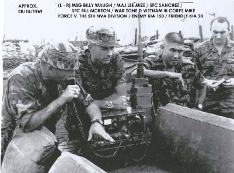 A black and white photograph depicts a group of soldiers in military uniforms, with one soldier holding a radio and another pointing at a device. The soldiers are standing in front of a truck, and the background shows a military setting with tents and other soldiers. The photograph is captioned with various names and m... | Billy Waugh (second from left) with some of the "good men," whom he served with in Vietnam. (Courtesy photo) | 5e80bd34a62738b15c89bb4ae37eb287f189ac3ce7ab90a428bc56f313a98a39 | 000720973867 | 0 | 0 | 74 | 19 | 0 | 0 | |
