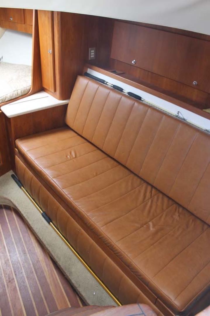 A brown leather couch with a tufted backrest and a wooden frame is situated in a room with wooden flooring and walls. The couch is positioned against a wall with a window, and there is a wooden cabinet with a glass door above it. The room has a warm and cozy atmosphere. | Buddy Davis-Express 2010-My Buddy Highlands-New Jersey-United States-Settee converts to Over/Under Berth-1212350 | Thumbnail | 3282a3ffd2a4fe807d604bb4404d4e707fc3025938a11f8263c90539e6136843 | 000720973926 | 0 | 0 | 52 | 13 | 0 | 0 | |