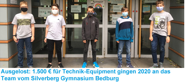 A group of young people wearing face masks are standing in front of a building. They are all wearing casual clothing, and some are wearing watches on their left wrists. The building has a sign that reads 'AUSGELOST' and 'TECHNIK-EQUIPMENT GINGEN 2020 AN DAS TEAM VOM SILVERBERG GYMNASIUM BEDBURG'. | Silverberg Gymnasium Bedburg | bf7b92cd01b302a3fa91ff6176744e4c7489028345af1cd919f93e3cd120c31a | 000720973795 | 0 | 0 | 49 | 3 | 0 | 0 | |