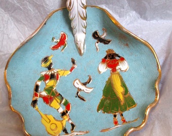 A vintage, hand-painted ceramic plate with a blue background and gold trim, featuring a colorful scene of a man playing a guitar and a woman dancing, surrounded by various birds and musical notes. The plate is displayed on a white cloth, and the image has a warm, nostalgic tone. | Vintage Italian Ceramic Bowl Signed Numbered Italy Art Pottery Hand Painted Dish Couple Dancing Birds | 9d7f35f2734c02a1ec09d9c77f233a1ee9018c14078b41dc0dbef06cb1d292d3 | 000720974550 | 0 | 0 | 49 | 15 | 0 | 0 | |
