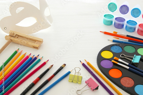 A variety of colorful art supplies are neatly arranged on a white surface. There are multiple colored pencils, a set of markers, a paintbrush, a paint palette with blobs of paint, and a pair of scissors. A wooden block with a hole in it is also present. | Purim celebration concept (jewish carnival holiday). Mask coloring fun artwork leisure and painting accessories | d345426e07790122b2f00d3f0a5962100fc03490e21ca4a22a71a255e957de9e | 000720974623 | 0 | 0 | 47 | 14 | 0 | 0 | |