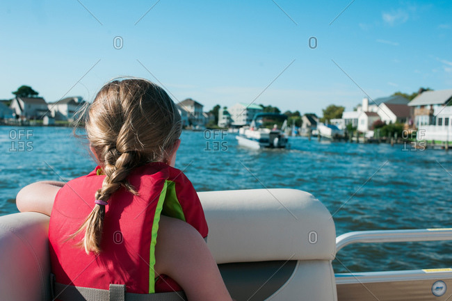 A young girl with blonde hair tied in a ponytail is sitting on a boat, wearing a red life vest with a green stripe. She is facing away from the camera, looking out at the water. The boat is on a river with houses visible in the background. The sky is clear and blue. | A young girl looks onto a lake from a boat | f4a8dab71c451396498540b952af87719de6cdb564968456243a9f2f6eb58823 | 000720975562 | 0 | 0 | 54 | 10 | 0 | 0 | |