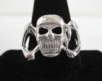 A silver ring with a skull and crossbones design is displayed on a velvet cushion. | Skull 925 Sterling Silver Men's Ring / Band - Large, Size 14 | d6942cd1e916c844d9b0bf1cd886c9eba90b5425d05d69954dfc6a2d59363d49 | 000720975323 | 0 | 0 | 15 | 12 | 0 | 0 | |