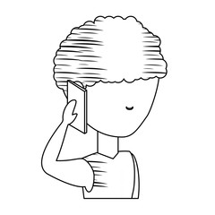 A black and white illustration of a person with a large, voluminous afro hairstyle, holding a smartphone to their ear. The person is depicted in a profile view, with the afro hairstyle extending upwards and to the sides. The smartphone is held in the left hand, and the person's right hand is raised to the ear. The illu... | sketch of avatar man talking on cellphone over white background, vector illustration | 4e9bd309840570d4197eec25f1b848f8038a761220b077a8327a23e9626698ab | 000720975680 | 0 | 0 | 64 | 12 | 0 | 0 | |