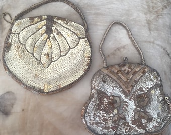Two vintage purses with intricate designs are placed on a wooden surface. The purse on the left has a textured, woven pattern with a goldish hue and a brownish handle. The purse on the right has a more detailed design with a white and gold color scheme, featuring a prominent owl motif. Both purses have a worn, aged app... | 1920s sequinned and beaded evening purse x 2 | 1b44d7fadf8f21575b8ea51c37f6287cca713fea5b48c5453c5c7f475adceb22 | 000720975819 | 0 | 0 | 59 | 8 | 0 | 0 | |