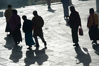 A group of people is walking on a cobblestone path. The individuals are wearing various colors of clothing, including blue, red, and yellow. Some are carrying bags, and one person is wearing a backpack. The scene is cast in a monochromatic tone, with the shadows of the people and objects creating a pattern on the groun... | Monks circumambulating at Chorten Kora, National Memorial Chorten, Thimphu, Bhutan | 9190f058adc96647ce28454bf4504918237167aaaee4bd0a7b637b06d8d72e7a | 000720975943 | 0 | 0 | 56 | 10 | 0 | 0 | |