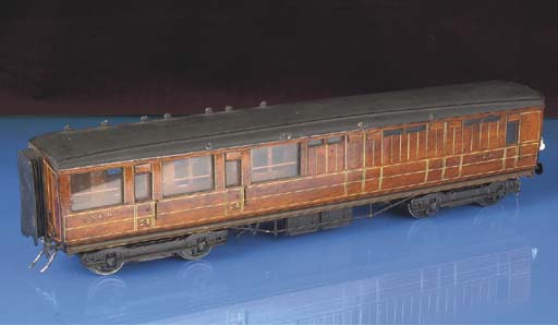 A vintage wooden train model with a black roof and brown body is displayed on a reflective blue surface. The train has multiple windows, a front observation car, and a locomotive at the front. The model is set against a dark background, and the lighting casts a shadow to the right of the train. | Three scratch-built 0 Gauge fi | d0aef1d0717baffbd4d71746503612945b726caa8d957c685f55803f36ae7fa4 | 000720976044 | 0 | 0 | 54 | 5 | 0 | 0 | |
