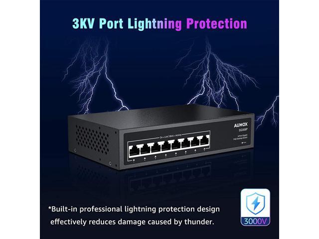 A product image of a 3KV Port Lightning Protection device with a dark blue background and a lightning bolt graphic above it. The device has a black casing with a label that reads '3KV PORT LIGHTNING PROTECTION' and 'Built-in Professional Lightning Protection Design, Effectively Reduces Damage Caused by Thunder'. There ... | Aumox 8 Port Gigabit POE Switch, 8 Port POE 120W, Gigabit Ethernet Unmanaged Network Switch, Plug and Play, Sturdy Metal Housing, Traffic Optimization | c2f783f78b2efd71b0eb3c3aca41cd79b07af0be581c87a4a1cd50e21402014a | 000720976034 | 0 | 0 | 61 | 23 | 0 | 0 | |