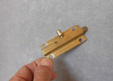 A person's hand is holding a small, metallic object with a visible screw and a flat surface. The object is positioned against a textured, light-colored background. | Vintage French bronze door latch lock -spring bolt , no keeper | 6fa8039d98d84a180d9f6c73c45426d7dfdbfe7e23d878df9c3852efda411246 | 000720976150 | 0 | 0 | 26 | 11 | 0 | 0 | |