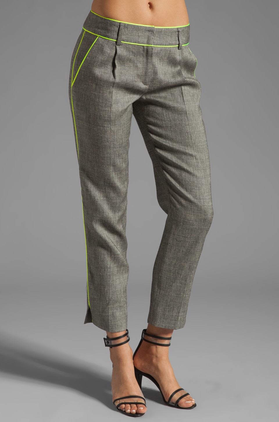 A woman is standing with her hands on her hips, wearing a pair of grey pants with a green stripe on the side and a black sandal on her left foot. | MILLY Italian Linen Viscose Twill Piped Nicole Pant in Black/Lemon | fa2ba17b27f85f538e06453653b68141cb760a9fb1793894e7a8a83c877f55ad | 000720975945 | 0 | 0 | 31 | 10 | 0 | 0 | |