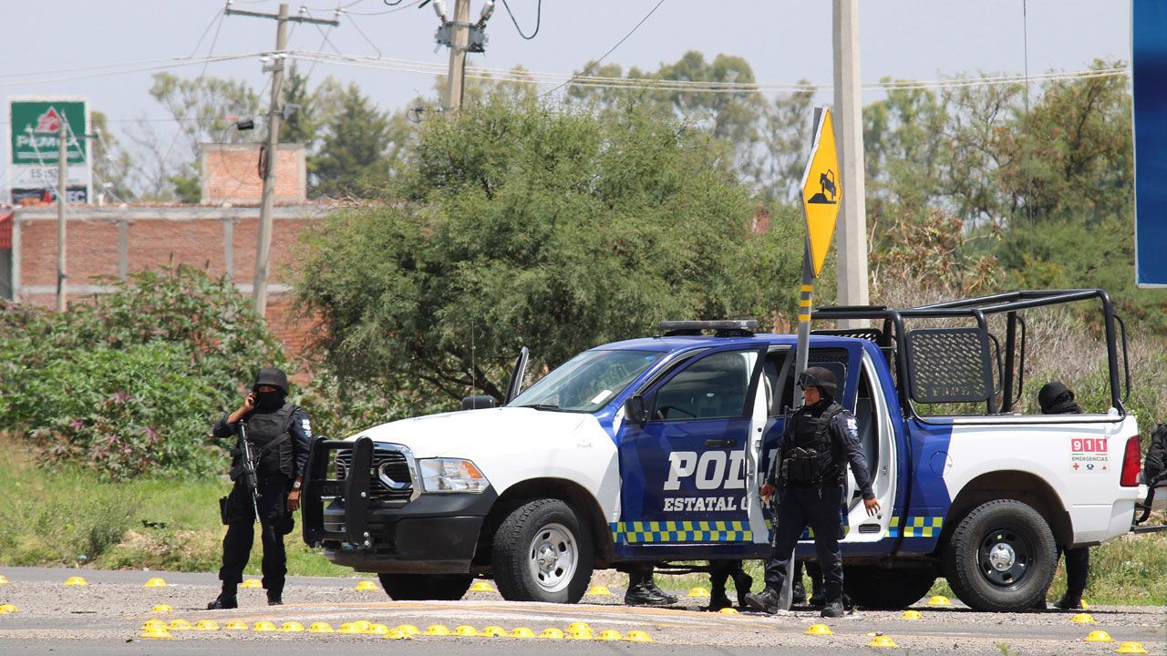 A police truck is parked on the side of a road with two police officers standing beside it. The truck has a sign on top with a yellow triangle and a black skull and crossbones symbol. There are yellow markers on the ground around the truck, and the scene appears to be a crime scene. | Data: Total number of law enforcement officers killed in Guanajuato during 2020 surpasses 2019 | 354556d07f07c35fea80e013944f83204bf44a30baff3671b841be29976b457a | 000720976001 | 0 | 0 | 55 | 14 | 0 | 0 | |