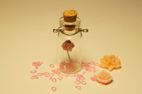 A clear glass bottle with a cork stopper contains a single rose petal and a small rosebud. The bottle is placed on a white surface with scattered rose petals and a few small rosebuds around it. | Miniature Origami Rose Necklace Purple Kawasaki Rose In | 024400020f4636206b658bbd3fffd6a4b99ffda03ca4a6c082b83400d636b1ba | 000720976518 | 0 | 0 | 36 | 8 | 0 | 0 | |