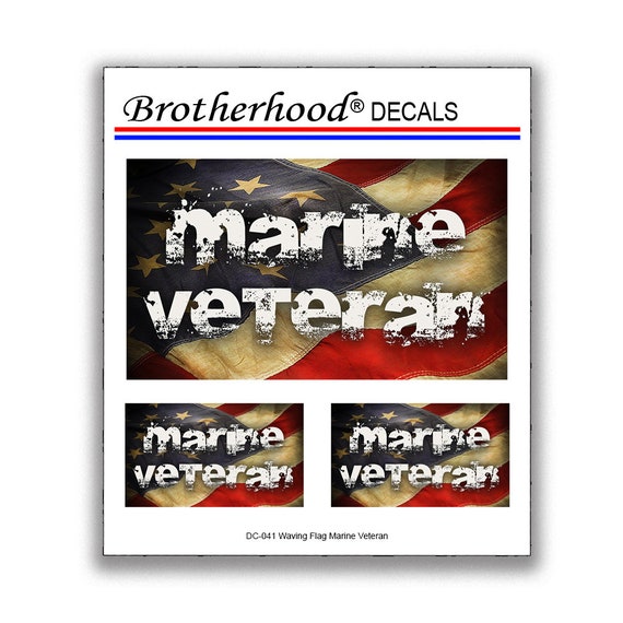 The second image is a close-up of the 'Brotherhood Decals' logo, which features the phrase 'Marine Veteran' with a distressed, aged appearance. The background is a red, white, and blue American flag, and the image is presented in a square format. The logo is centered and occupies the majority of the frame, with the fla... | Combat Veteran USMC Vinyl Car Truck Window Decal Sticker US Seller MArine Corps | f366a9522aebb749305814895232126409d4b6fda53d000c87df25da127ff825 | 000720976479 | 0 | 0 | 60 | 13 | 0 | 0 | |