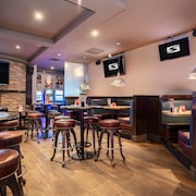 The first image shows an empty bar interior with a modern design. The bar has a long counter with stools in front of it, and there are additional stools and tables scattered throughout the space. The walls are adorned with framed pictures and mirrors, and there are multiple flat-screen TVs mounted on the walls. The lig... | Sports Bar | 569e7232070aabbab2d6ceec0b9f47b26d4108c4903ea9a63beec4616c74d597 | 000720976358 | 0 | 0 | 66 | 2 | 0 | 0 | |