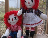 Two handmade rag dolls with red hair and white faces are sitting on a wooden surface. The doll on the left is wearing a red and white checkered shirt with a blue skirt, while the doll on the right is wearing a white dress with red and blue trim. Both dolls have black shoes and striped socks. | Raggedy Ann and Andy dolls | b6f38f3a894f7e665eca036d3b36a4135f66cfcef9958847c0ae520d7892bdd0 | 000720976492 | 0 | 0 | 57 | 5 | 0 | 0 | |