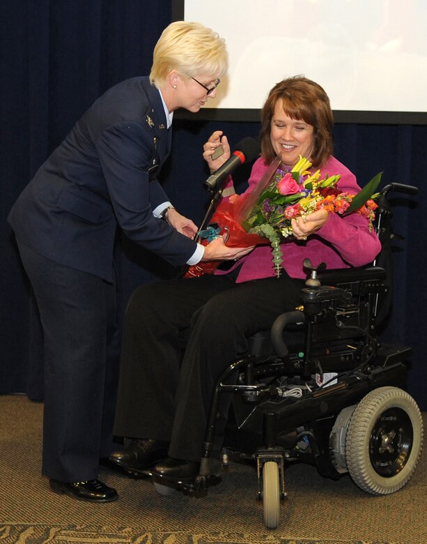 A woman in a wheelchair is receiving a bouquet of flowers from a woman in a military uniform. The woman in uniform is standing next to the wheelchair, holding the bouquet with both hands, and appears to be presenting it to the seated woman. The seated woman is smiling and looking up at the woman in uniform. The setting... | Col. Anita Latin, Los Angeles AFB Air Base Wing commander, presents keynote speaker Ms. Ren\xc3\xa9e Bondi with a bouquet during her closing remarks at the 2009 National Prayer Breakfast held at the Gordon Conference Center, Feb. 11. Ms. Bondi shared her life\xe2\x80\x99s story and her faith in God in an upbeat and in... | c67371ebcbd2faa4bdeb9055865eabfadb3f2c2a60e36567382a13d9ba44ad61 | 000720976411 | 0 | 0 | 69 | 66 | 0 | 0 | |
