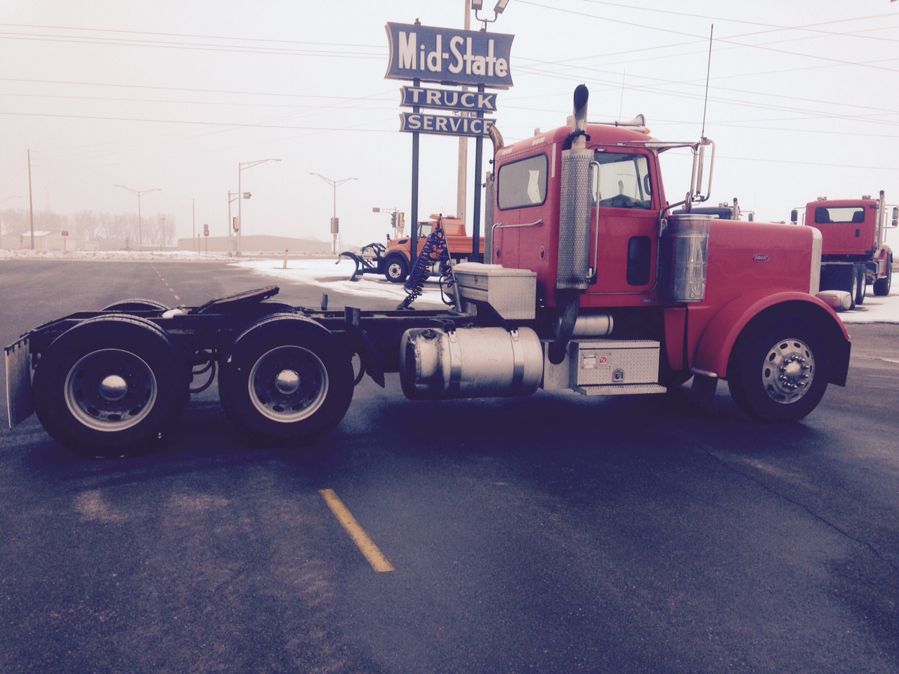 A red semi-truck is parked on the side of a road with a 'Mid-State Truck Service' sign above it. The truck has a flatbed trailer attached to it. The road is wet, and there is a yellow line painted on it. In the background, there are other trucks and a snowy landscape. | 2008 Peterbilt 388 for sale-59067103 | 16818257e1ded25f09236fd1b3342dab0b071b5ce103ebabce5efcb643c06f7f | 000720976352 | 0 | 0 | 52 | 5 | 0 | 0 | |