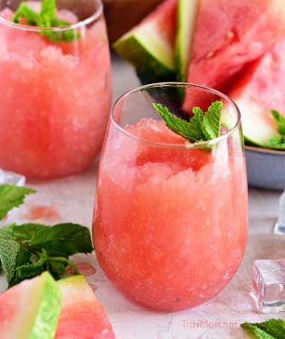 A glass of pink watermelon juice with ice cubes and a sprig of mint garnish is placed on a white surface. The glass is filled to the brim with the juice, and there are watermelon chunks and mint leaves scattered around it. In the background, there is a bowl with more watermelon chunks and mint leaves. | Take your bottle of Riesling to the next level with this recipe for a Watermelon Grapefruit Wine Slush. It's the backyard BBQ drink of the summer. Print full recipe at TidyMom.net | d46756c2a168a0e802b665bc0ca921bcdaadcbd383732e2c13aede7e03f7b9bf | 000720976501 | 0 | 0 | 56 | 31 | 0 | 0 | |