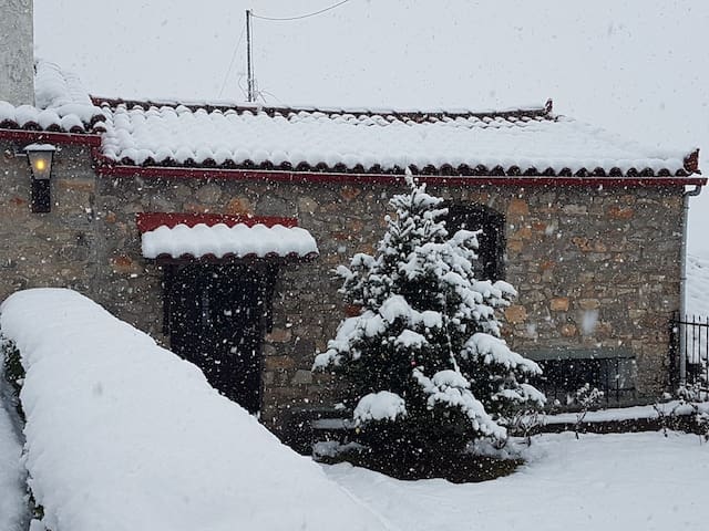 A small stone cottage with a red roof is covered in snow, with a snow-covered tree in front of it. The sky is overcast, and snowflakes are falling. The ground is blanketed in snow, and there is a snow-covered wall on the left side of the image. | Ano Kalyvia - Niko's Traditional Stone House | fae9ee13539ecbb0f1b52a1a7ab29bf851da3ddee8aa74c8a493355e25aa7701 | 000720976811 | 0 | 0 | 47 | 7 | 0 | 0 | |