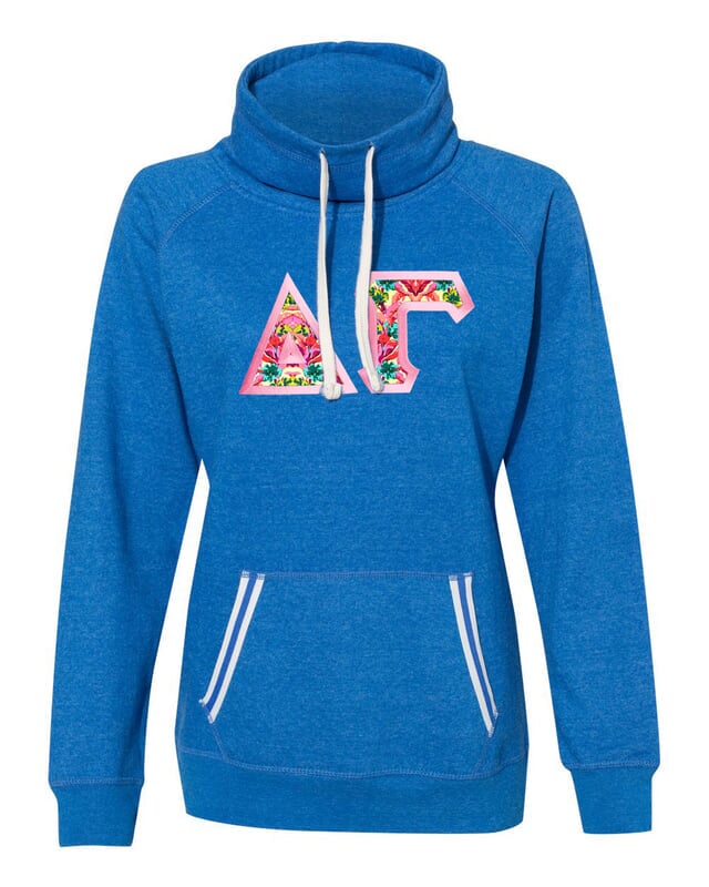 A blue hoodie with a floral design on the front and the letters 'A' and 'G' embroidered on the chest. The hoodie has a hood, long sleeves, and a front zipper. The sleeves have cuffs, and the hoodie has a ribbed collar. The floral design on the front is colorful and features a mix of pink, yellow, and green flowers. | Delta Gamma J. America Relay Cowlneck Sweatshirt | cbbd6582eb89a2ecf069b0a09b2033f842483de065511fe222eedcc6fe212d1b | 000720976813 | 0 | 0 | 60 | 7 | 0 | 0 | |