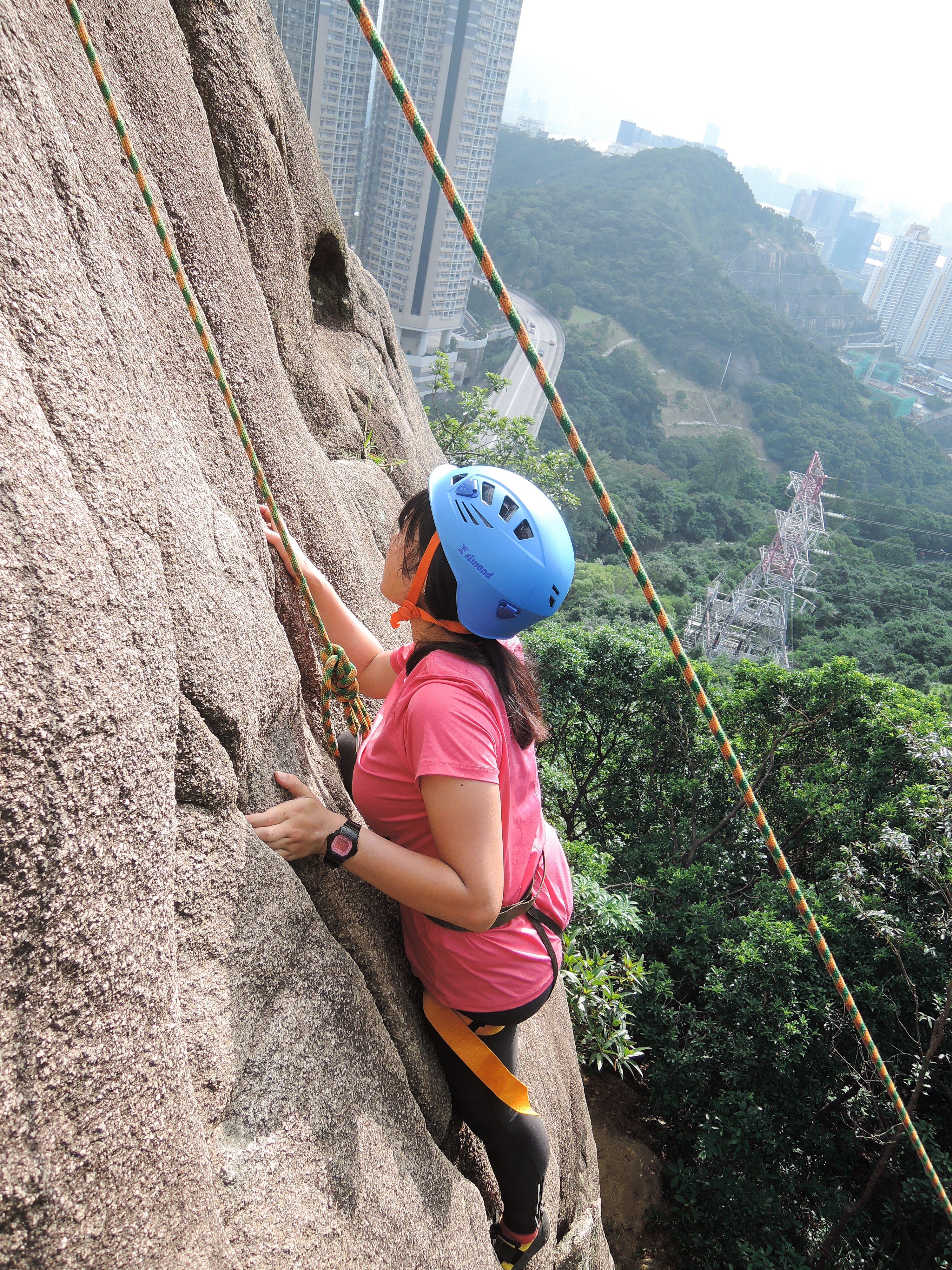 A woman in a pink shirt and blue helmet is climbing a rock face with a rope attached to her harness. She is wearing a watch on her left wrist and has a backpack on her back. The background shows a cityscape with tall buildings and a bridge. | Rock Climbing at Choi Hung | 032faf32f71324d1c1f884e5cc1db9e4c4e41b4146cc7bea45008a455a4053a0 | 000720976725 | 0 | 0 | 48 | 5 | 0 | 0 | |